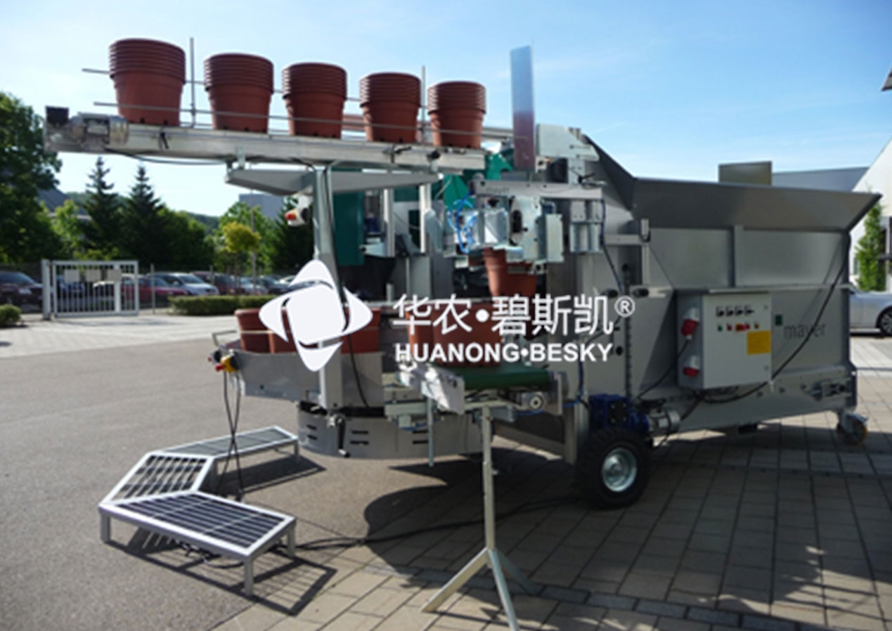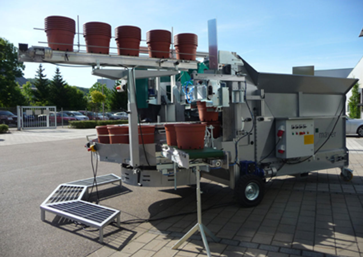 TM2432装盆机于2009年秋季上市,是MAYER研发的新款机型。该盆机的特点:能结构料仓,防止空洞形成;基质提升器带有防护滚子链,热镀锌铲具;基质输入速度频率驱动可调节,向前和向后双向;转台由手柄进行中心调节,适用14个直径范围9-32cm的圆形和方形花盆。