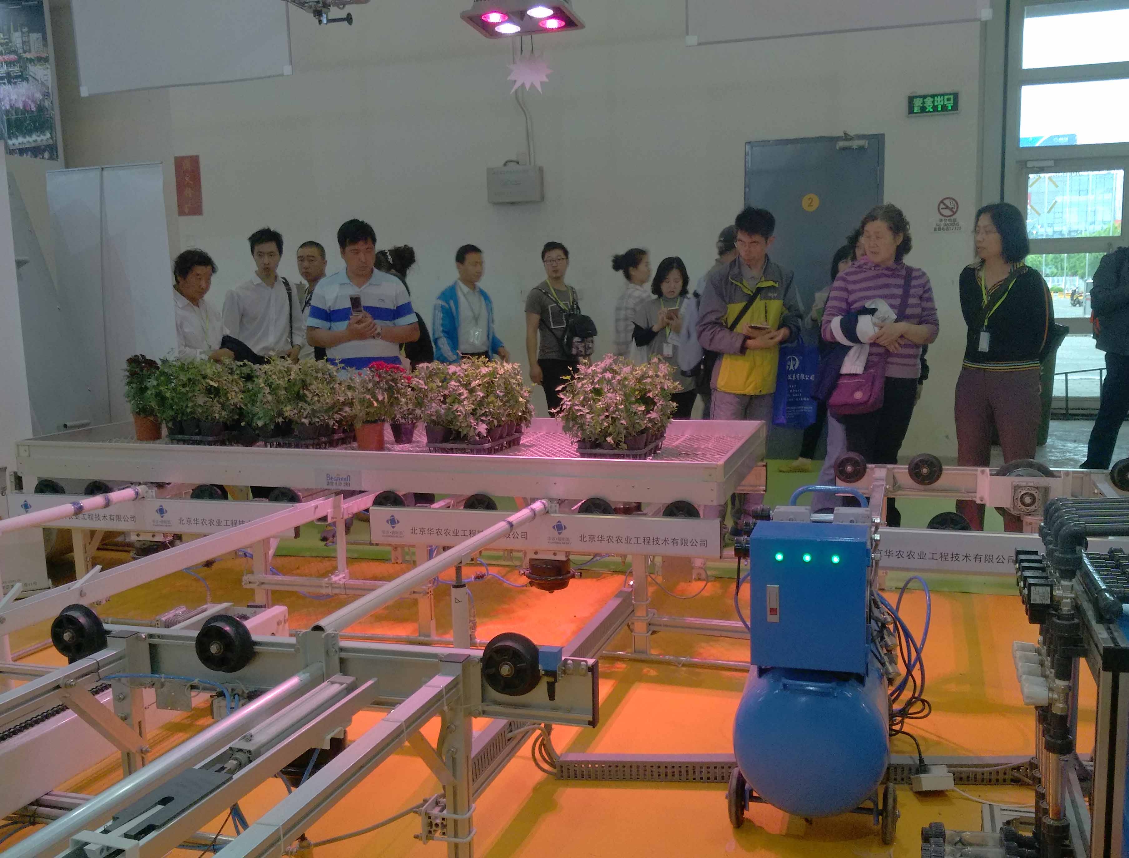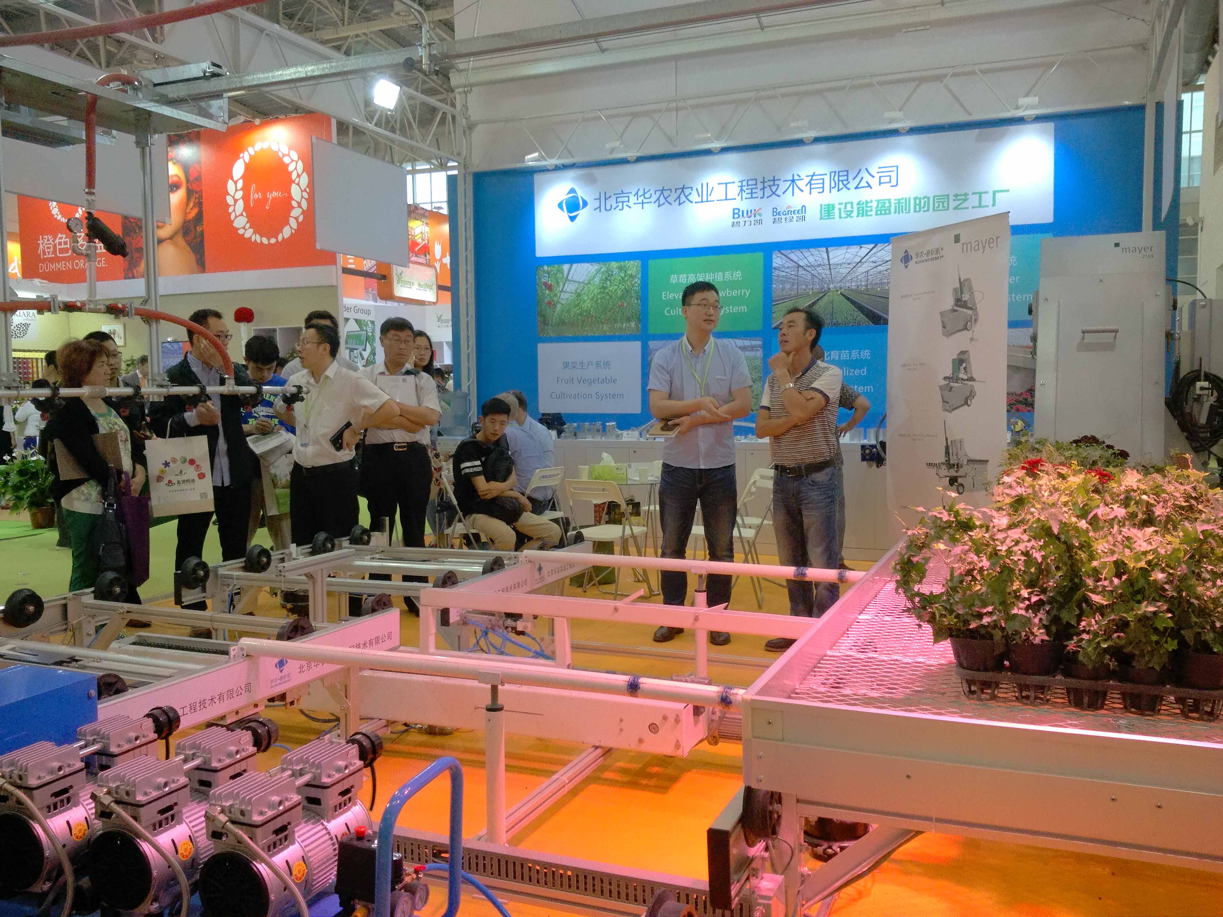 2016年5月11~13日,由中国花卉协会主办的第十八届中国国际花卉园艺展览会在北京中国国际展览中心新馆举办。作为北京华农工程技术有限公司自主研发园艺科技的代表,全自动物流苗床系统继上届展会再次亮相,行业青睐有增无减;轮盘式喷灌机、水肥一体化精准施肥机和AGV运输车首次推出,便迎来国内外同行及参展者的浓厚兴趣与赞叹。