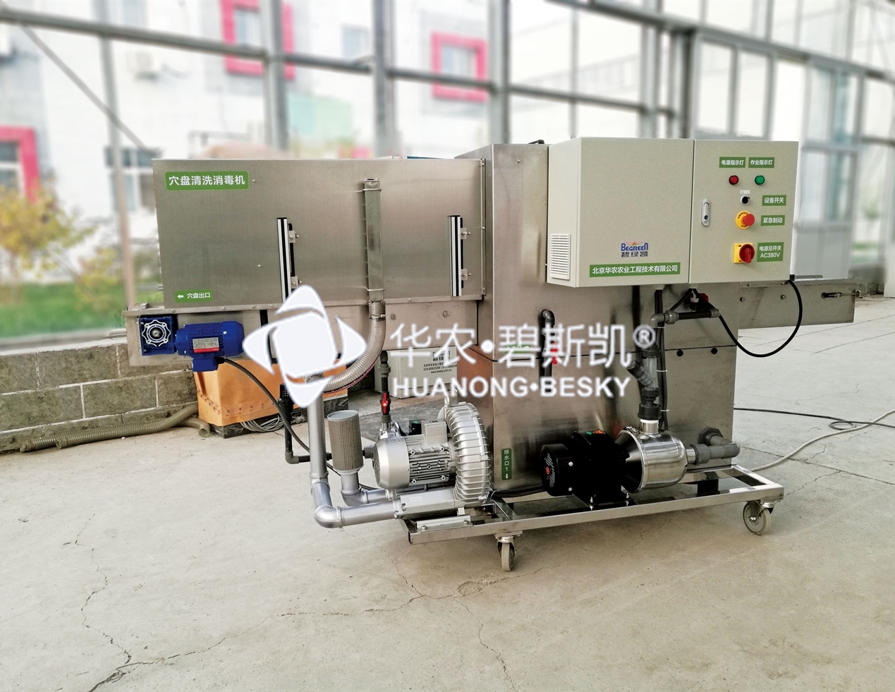 装备专门用于穴盘清洗和消毒,采用不锈钢 结构清洗槽,适合多种尺寸范围的育苗容器, 清洗时间可设定。清洗系统包括穴盘喂入、 穴盘清洗、穴盘消毒和清洗污水过滤循环等 作业环节。清洗速度可通过变速器调节,清 洗室设有旋转高压喷水嘴,清洗水流由多级 离心泵增压,洗涤水通过不锈钢过滤网过滤 后流入回收底槽循环使用。