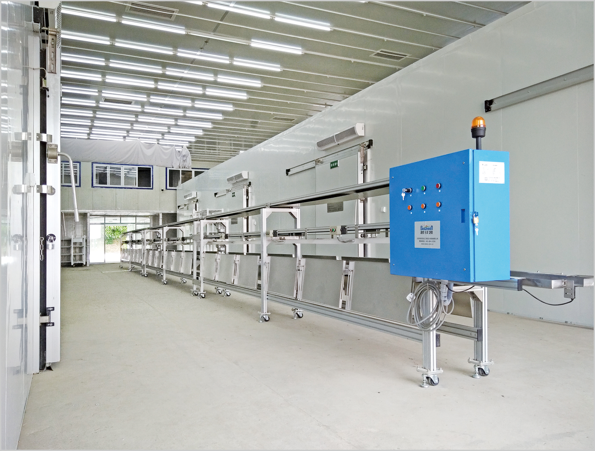 整体设四个紧急停止控制按钮,为可移动式,脚 轮带有锁定装置。可根据客户的育苗规模,对若 干个标准单元进行联接,调整或延伸生产线长度, 并配设相应的电控箱。采用该生产线可显著增加 嫁接苗成活率,降低个人劳作强度,提升嫁接工 作效率。