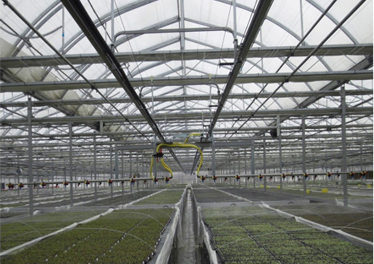 采用与单跨长度超过40米的温室,最长可达150m,该喷灌机一跨内安装一台,不能够进行跨间转移,运行可靠,一台控制器可以控制单台或多台喷灌机。